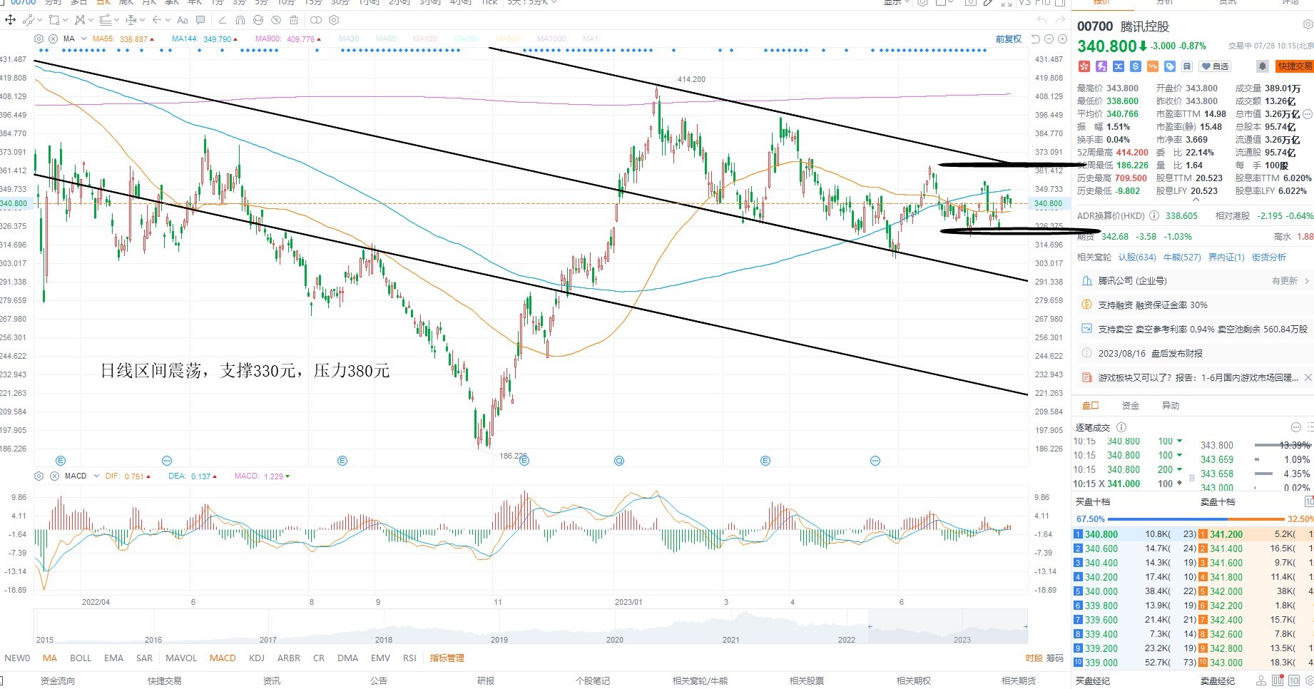 腾讯控股短期维持盘整,反弹乏力,主要是流动性制约,同时指数并未共振走强,持续性有待进一步观察,但目前通道支撑330元附近反复盘整不破,则存在企稳低吸机会,日内等待反弹为主,上方通道压力380元附近