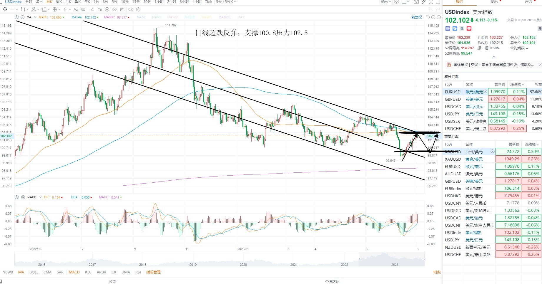 美元指数超跌反弹,短期遇阻,不过美债收益率同步上行,结构上带动美元走强,目前市场在等待本周的经济数据,是否进一步支撑加息预期,从而使得美元指数向上突破,日内关注ADP数据以及周五的非农数据,等待美元方向选择,金价方面继续震荡下行,短期并未跌破区间支撑,但是走势很弱,关注美债收益率是否进一步上行施压金价,其次是美联储加息预期,是否升温,美原油方面大幅走高,主要是风险偏好上行,支撑油价,等待回踩之后的低吸机会为主
