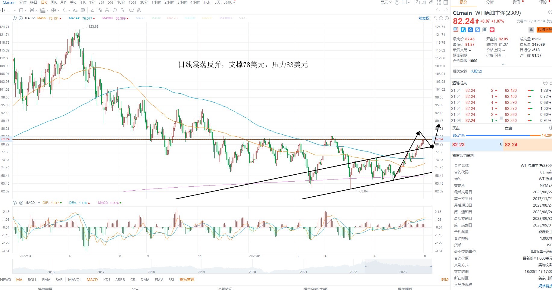 美原油大幅走强,短期测试密集压力区间,且不排除突破的可能性,基本面上风险偏好进一步回暖,支撑油价走强,其次供给端压力库存下行,支撑油价,而需求端上依然存在不确定性,主要是美国经济数据向好,提振加息预期,日内等待库存数据落地之后的方向选择,日线级别多空分水岭83美元突破则进入多头反转区间,下方支撑78美元附近