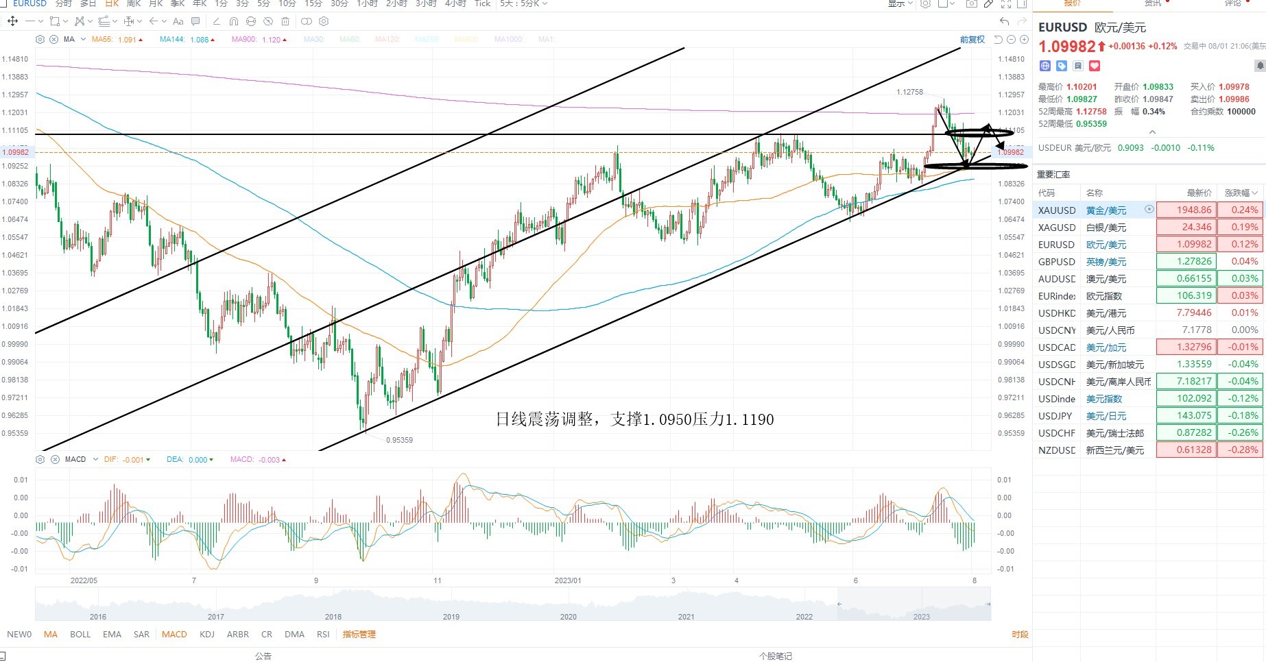 欧美冲高回落,短期因美元指数持续反弹,施压非美,且市场对于美联储的加息预期有升温的迹象,主要是经济数据走高,通胀依然没有明显的拐头加速向下,日内需要等待非农数据之后的方向选择,欧美日线级别多空分水岭1.0950附近跌破,则本轮上升趋势线破位,短期进入空头结构,不破则有望再次反弹,上方压力1.1090