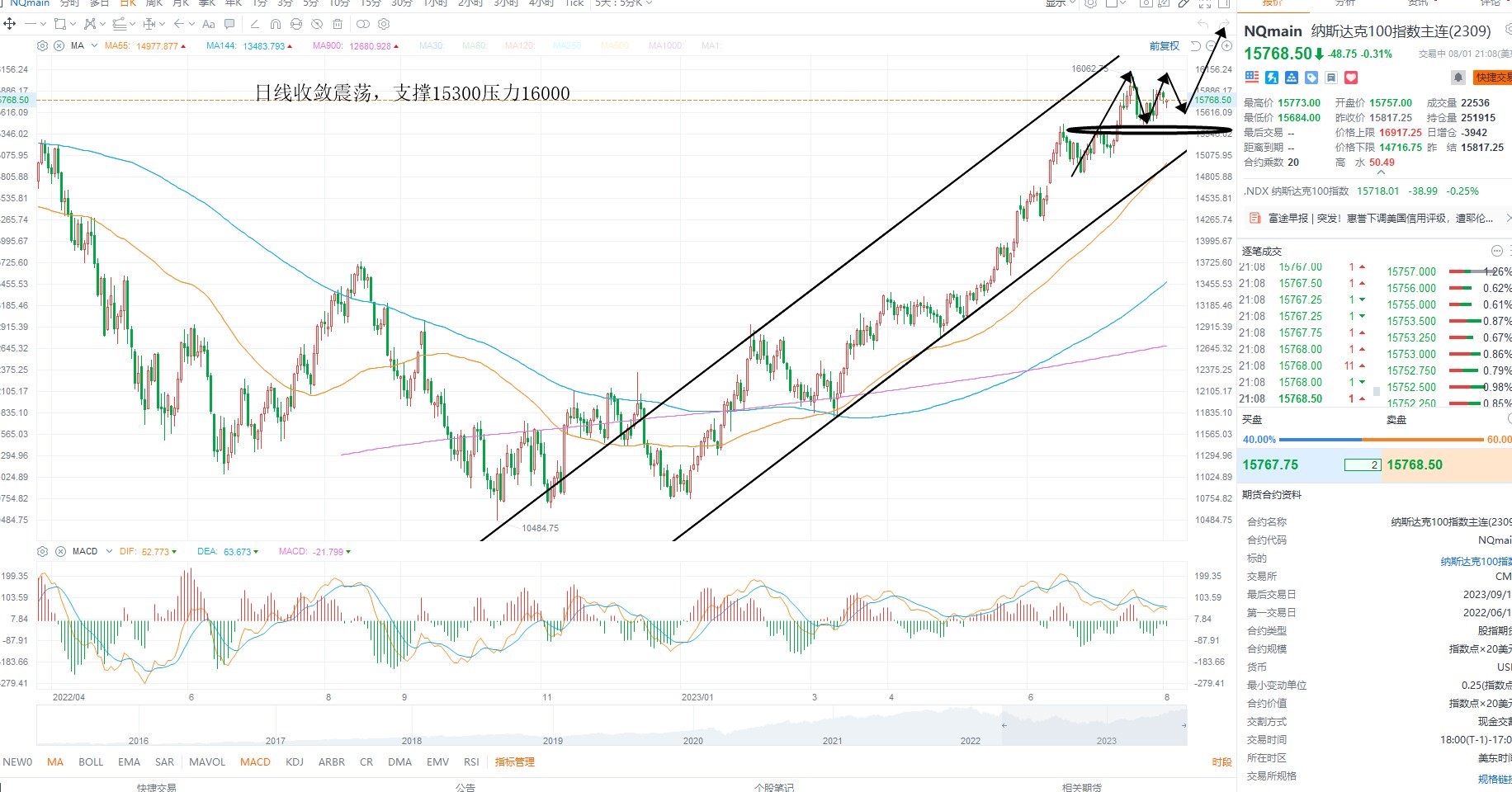 纳斯达克指数维持高位震荡,短期并未跌破区间支撑,反而是等待指标修正之后的方向选择,且市场风偏进一步升温,不排除收敛之后继续向上加速的可能性,日线级别收敛支撑15300附近盘整不破,反复低吸,上方压力16000站稳则有望加速上行