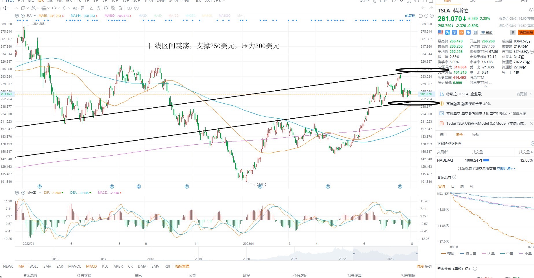 TSLA短期继续震荡调整,目前并未出现止跌迹象,而指数同步进入收敛区间,短期需要等待企稳之后的共振机会,基本面上分子端业绩增速预期不高,本轮上行的动力是估值修复,若业绩增速没有明显的拐头上行,则不排除区间震荡的可能性,日线级别支撑250美元附近盘整不破,反复低吸,上方压力300美元,区间对待