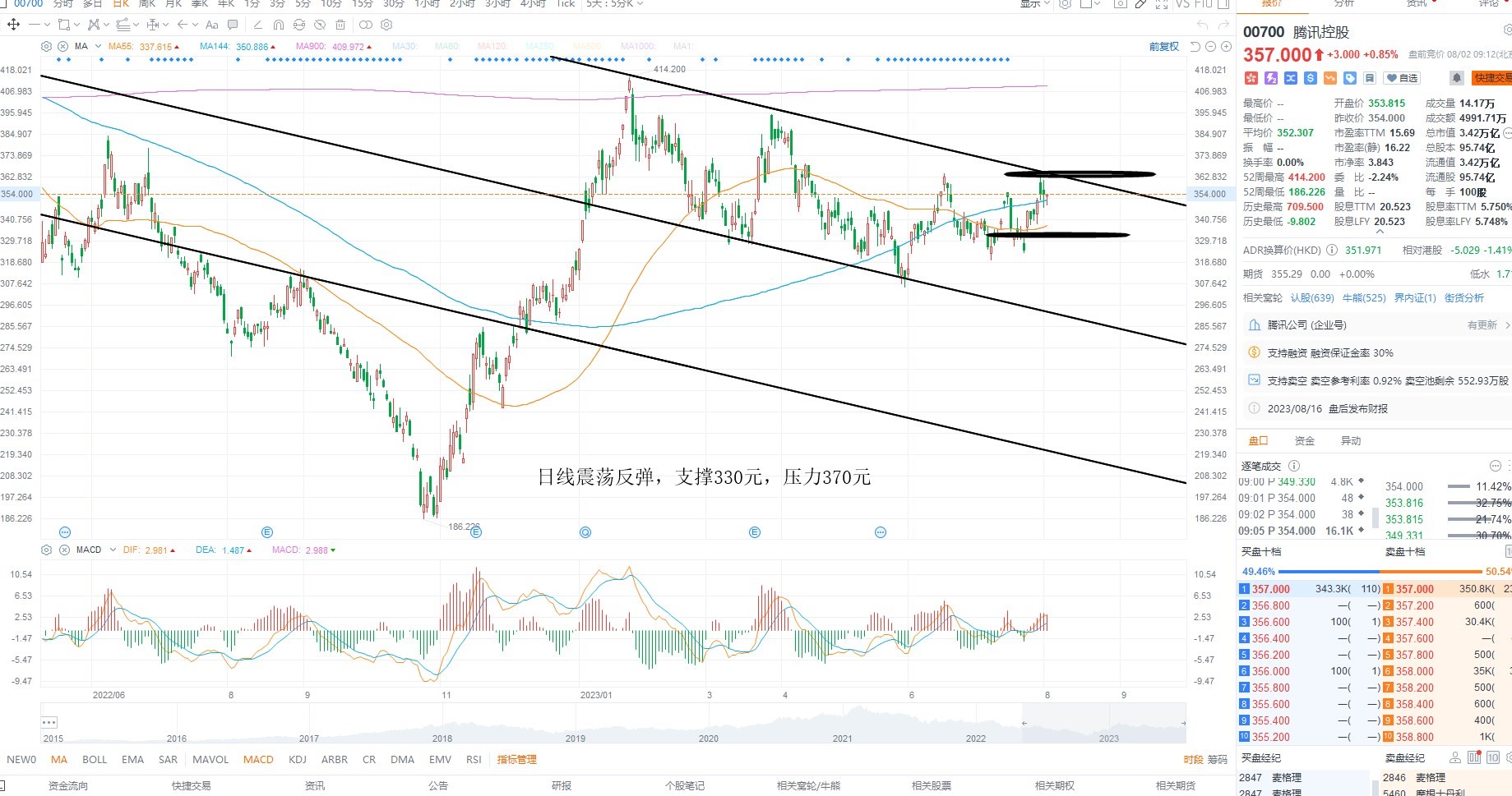 腾讯控股短期继续反弹,结构上并未突破通道压力,且基本面上只是估值修复,并不是反转,目前需要等待指数级别的共振才有可能进入方向选择区间,再没有突破下降通道之前,维持区间对待,日线级别回踩支撑330元不破,继续低吸,上方压力370元,突破则进入反转区间