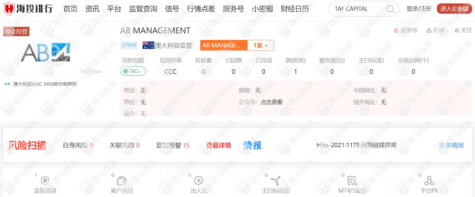 这家平台叫AB MANAGEMENT,成立于1995年,从2004年开始受澳大利亚ASIC监管,监管号码240520,目前已经停止经营,风险扫描显示15条风险,投资者需注意其风险提示。