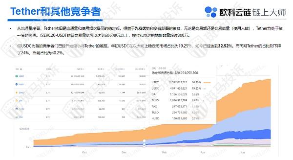 欧科云链《2021数字资产半年报》显示:截至7月1日,以太坊上的稳定币流通总量达776亿美元,其中USDT、USDC、BUSD、DAI以及TUSD是流通量前五的稳定币,流通量均在10亿美元以上,共计占据95.5%的市场份额。