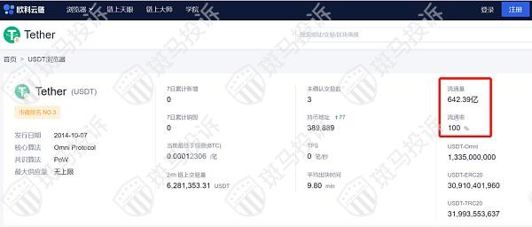 据了解,USDT的主要盈利来源是提现法币时收取的手续费和用户用于兑换USDT的法币所产生的利息。欧科云链OKLink官网显示,截至2021年7月21日,USDT在市面上的流通量高达642.39亿,流通率高达100%,日内流通量远超比特币。