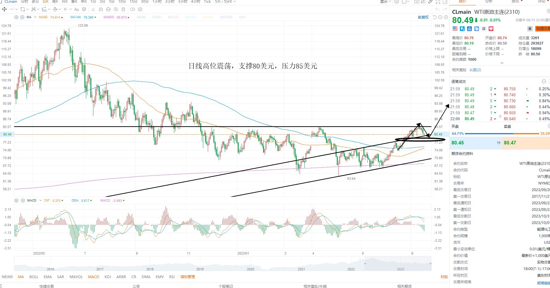 美原油震荡回踩,短期依然是多头上行,虽然没有突破密集压力区间,但是整体结构偏多,且基本面维持多头结构,库存继续下行,若晚间EIA库存超预期下行,则有望重拾升势,继续关注需求端的变化,日线级别多空分水岭80美元附近,上方压力85美元