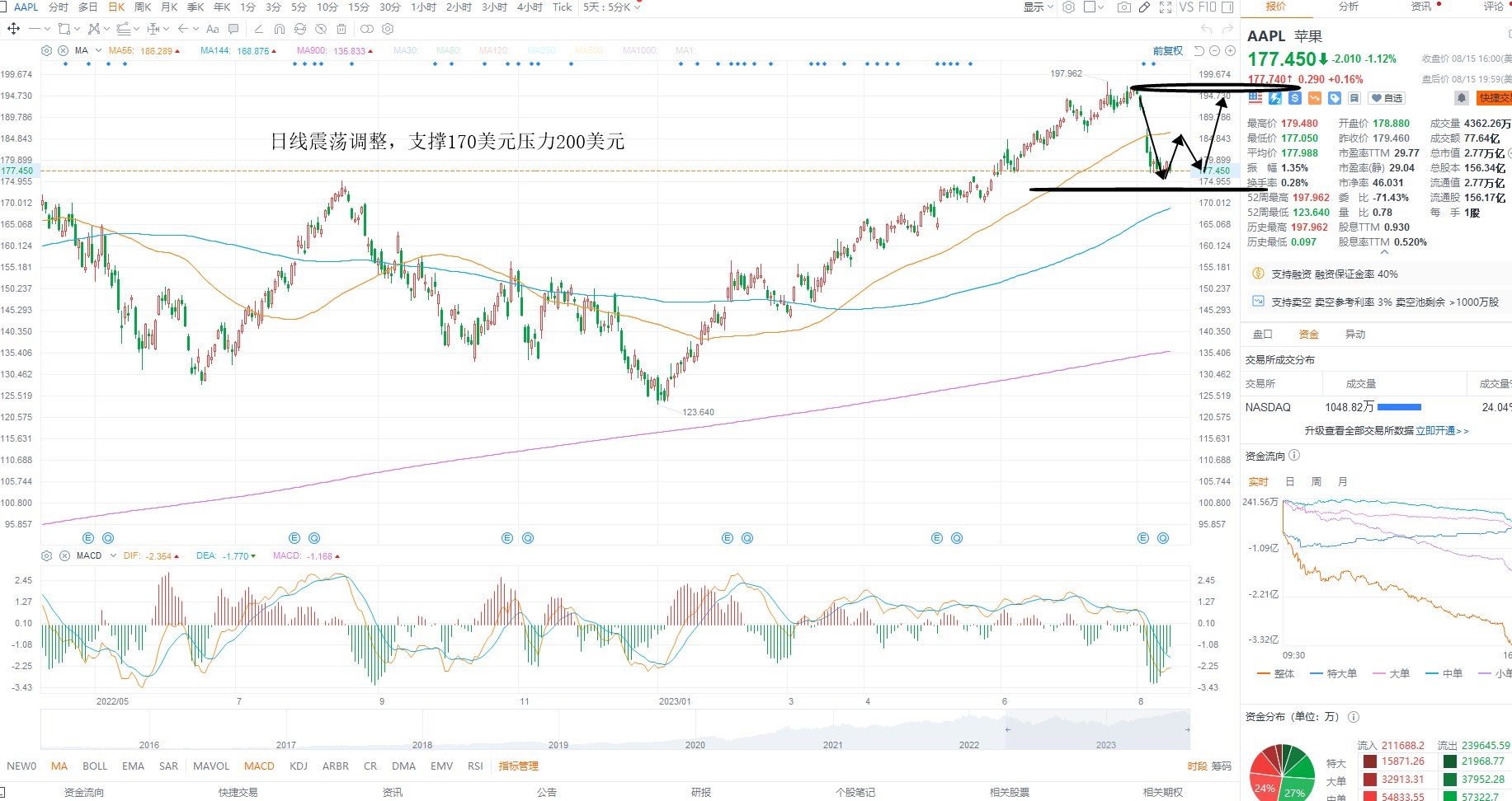 AAPL短期维持震荡调整,目前并未跌破支撑区间,且本轮调整属于新高之后的第一次回踩,所以整体结构依然存在二次反弹的可能性,等待指数企稳之后的共振机会,日线级别多空分水岭170美元不破,则等待低吸,上方压力前期高点200美元附近