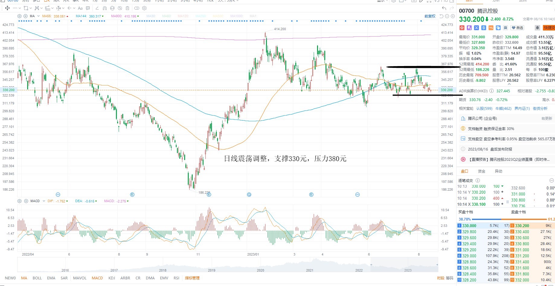 腾讯控股短期维持震荡调整,目前并未跌破支撑区间,基本面上需要市场风偏回暖,且成交有效放大才有可能重返箱体上沿,短期等待指数级别共振为主,日线级别支撑330元附近反复低吸,上方压力380元附近