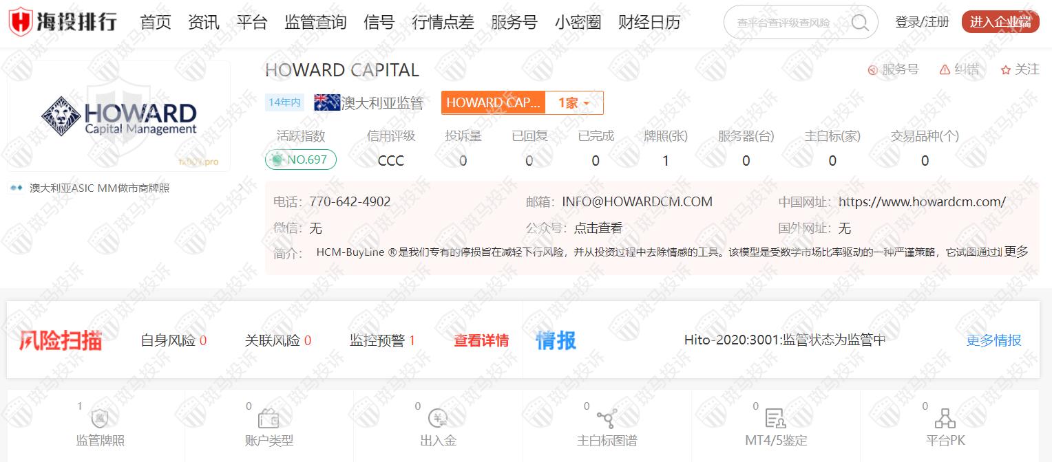 HOWARD CAPITAL全球排名697,从2017年开始受澳大利亚ASIC监管,监管号码494420,风险扫描显示1条风险,投资者需注意其风险提示信息。