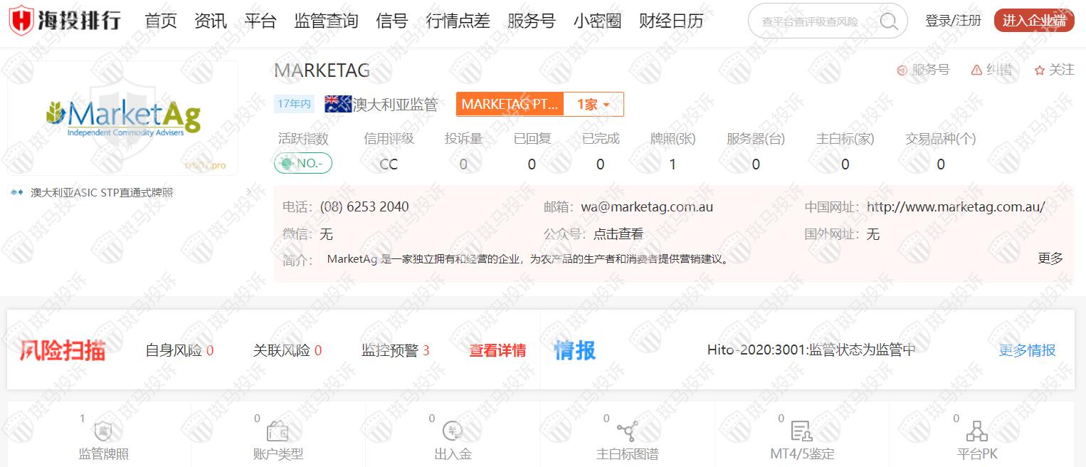 MARKETAG从2008年开始受澳大利亚ASIC监管,监管号码325936,风险扫描显示3条风险,投资者需注意其风险提示信息。