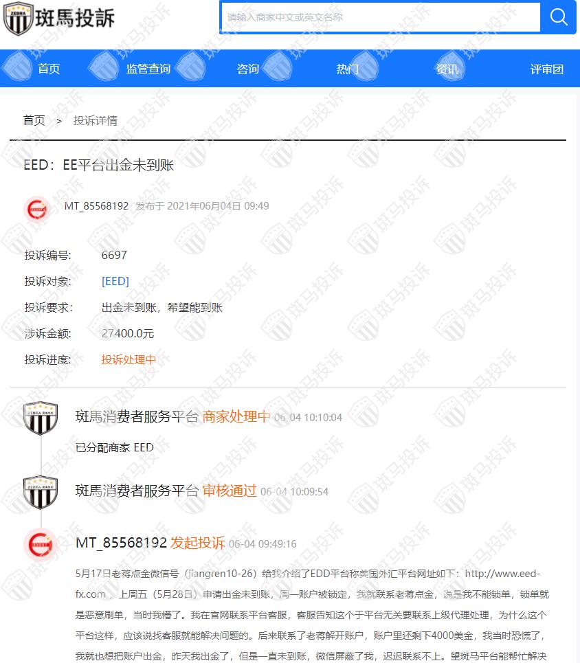 据投诉者反馈,5月17日老蒋点金微信号(jiangren10-26)给用户介绍了EDD平台,称是美国外汇平台,网址为:http://www.eed-fx.com,5月28日用户申请出金未到账,5月31其账户被锁定,于是用户就联系老蒋点金,被说是恶意刷单,当时用户懵了。后来在官网联系平台客服,客服告知这个与平台无关要联系上级代理处理。后来用户再次联系老蒋解开账户,账户里还剩下4000美金,用户想出金,但是出今后一直未到账,老蒋屏蔽了他的微信,迟迟联系不上。用户希望斑马投诉平台能帮忙解决。