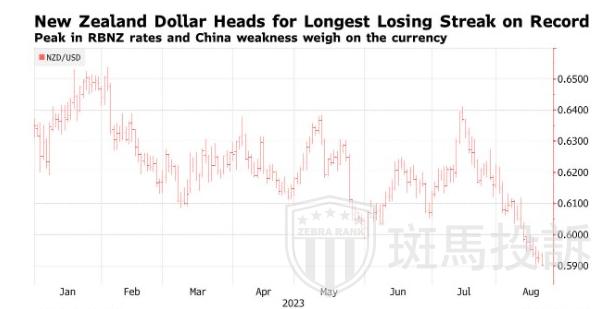 新西兰央行连续第二次会议决定维持利率不变,令该国货币承压,同时其他国家的政策制定者正在考虑进一步加息。贸易商还担心中国经济的影响,中国是新西兰最大的贸易伙伴。自本月初以来,新西兰元兑美元的表现一直落后于10国集团(十国集团)的其他货币,下跌了近5%。
