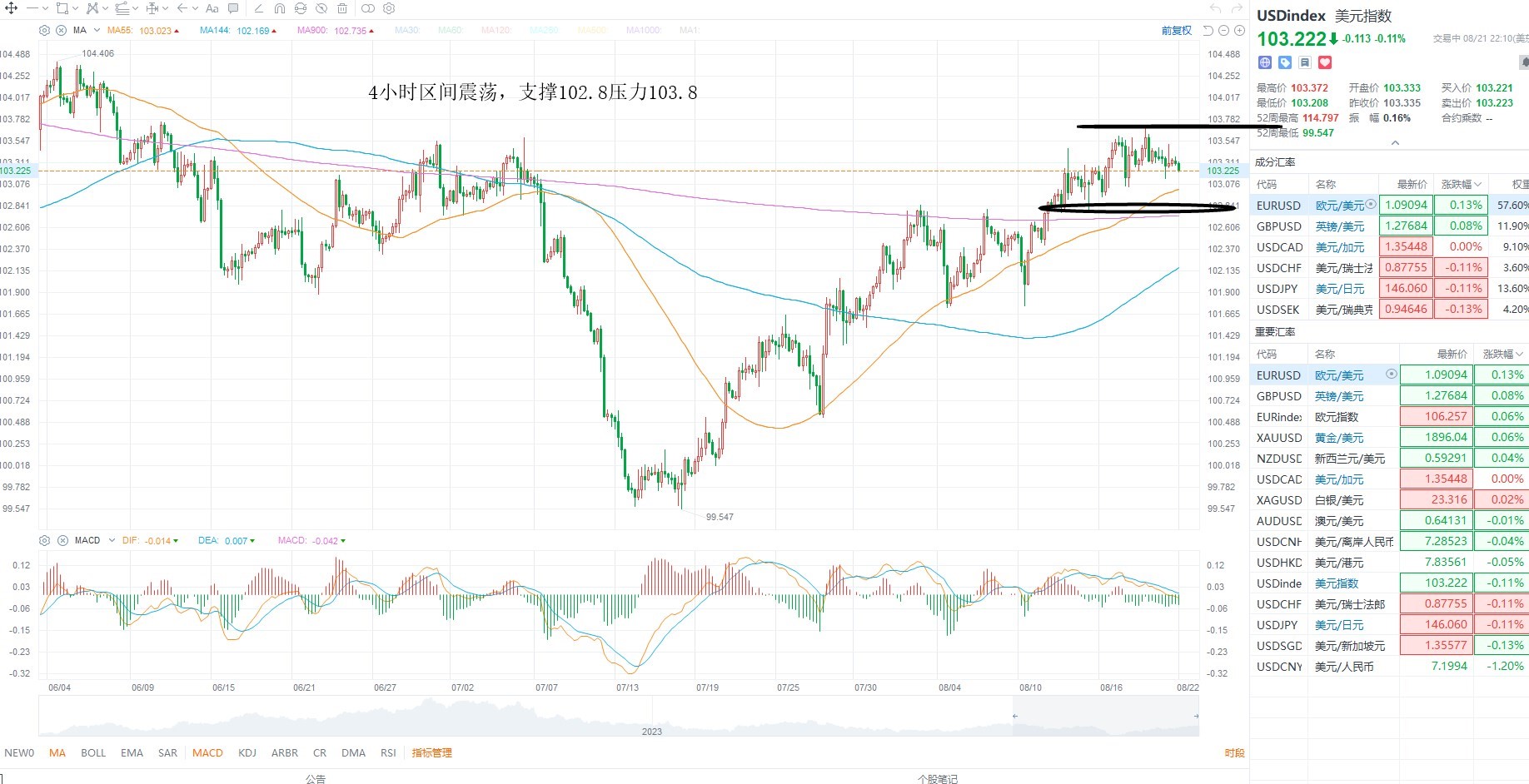 美元指数维持高位震荡,目前并未出现明确的方向选择,短期来看,美债收益率继续新高,带动美元多头,不过市场依然处于高利率阶段,所以短期美元大幅走低的概率并不大,维持震荡对待,等待方向选择,金价方面虽然出现了超跌反弹,但是美债收益率依然维持高位运行,所以日内偏空为主,等待压力测试之后的沽空机会,美原油方面短期箱体震荡,冲高回落之后有望再次反弹,等待均线上移为主,继续关注库存数据的变化