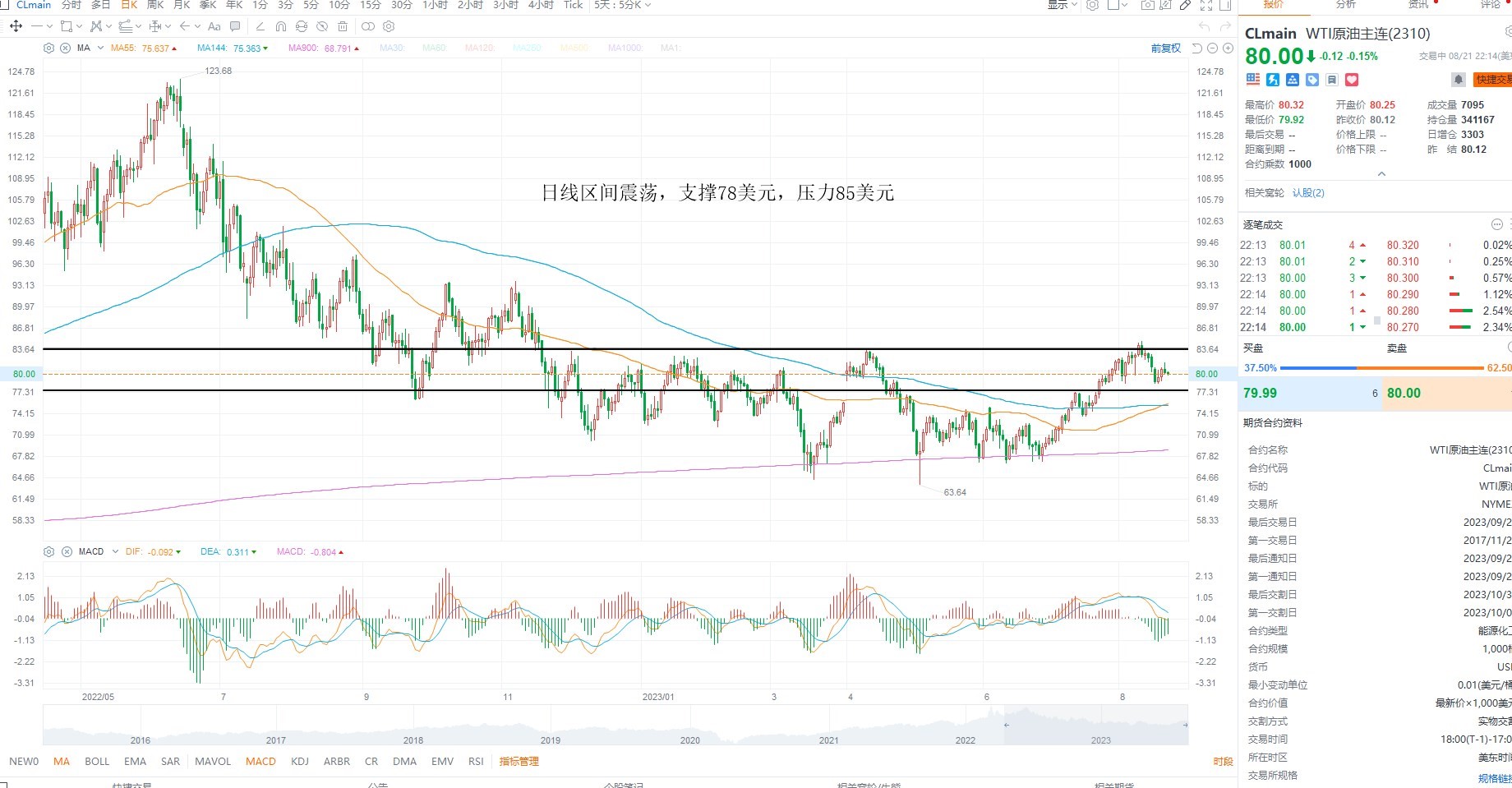 美原油维持箱体震荡,目前并未跌破均线支撑,主要是上方密集压力区间需要基本面的变化推动,因此在没有出现需求端反转之前,依然维持震荡对待,短期高抛低吸为主,日线级别支撑78美元附近不破,反复低吸,上方压力85美元附近