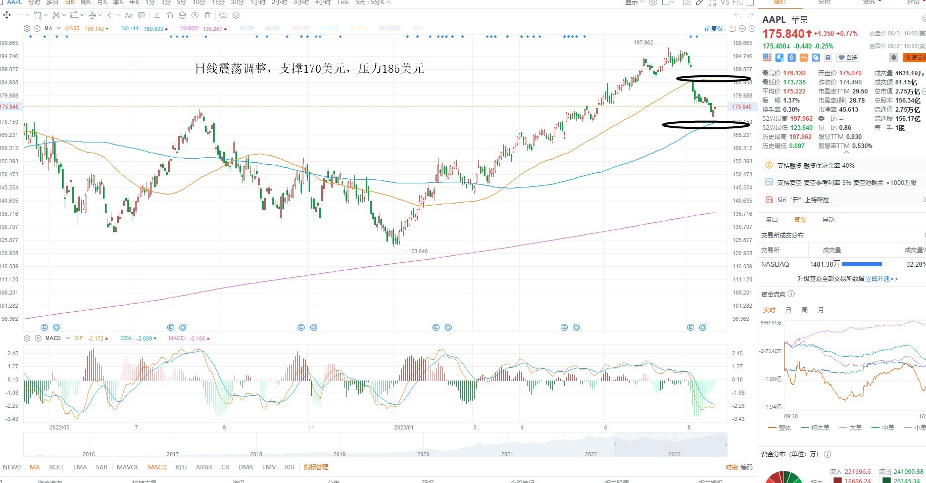 AAPL短期跟随指数反弹,目前基本面上分母端利率上行,不利估值扩张,因此这里的上涨仅仅只是反弹,短期新高的概率不大,维持震荡运行对待,若短期再次回踩170美元上方不破,则有望重拾升温,日内等待低吸机会,上方压力185美元附近
