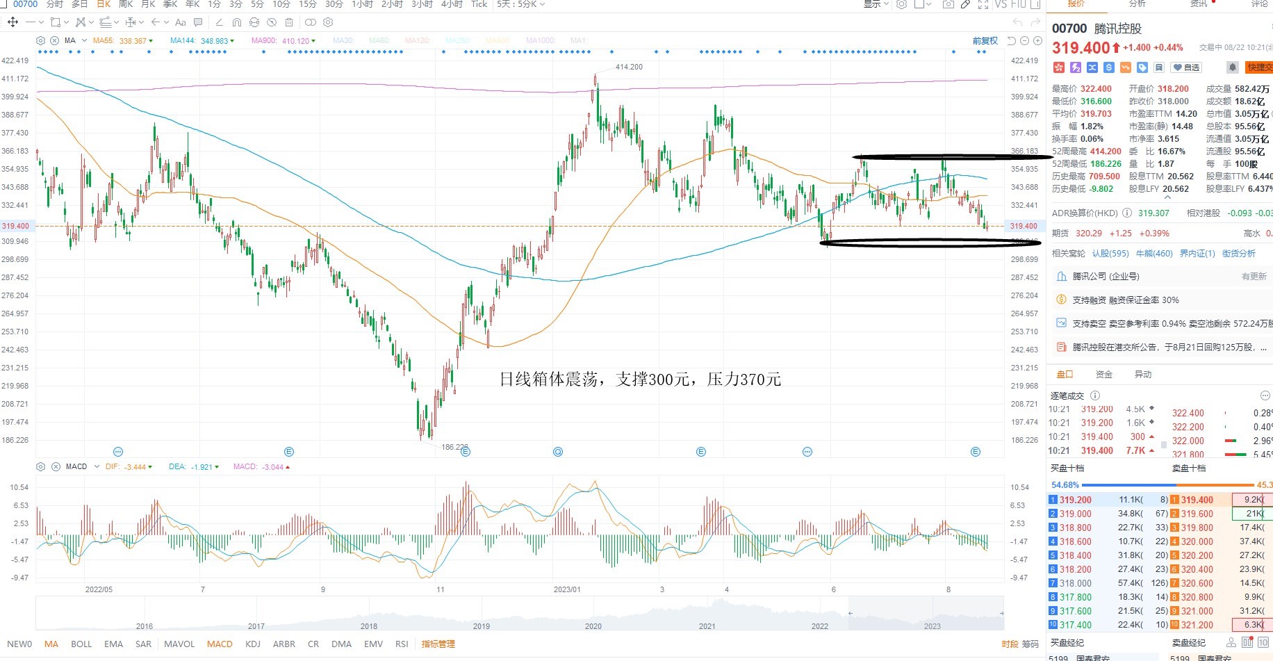 腾讯控股跟随指数调整,目前权重并未出现合力,且市场风偏进一步走弱,整体结构不支持情绪回暖,因此需要等待指数进一步向上突破之后的共振机会,腾讯控股日线级别多空分水岭300元上方等待低吸机会,日内箱体压力370元附近