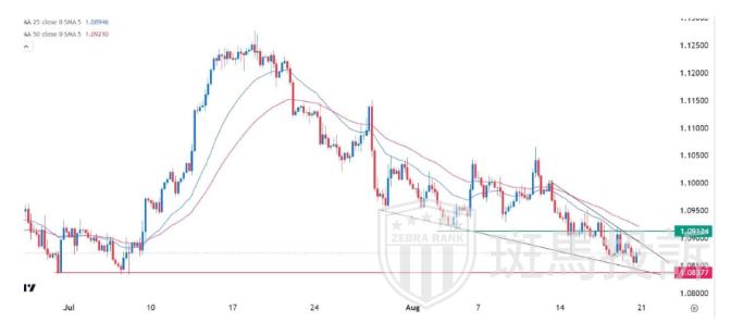 欧元兑美元货币对的技术分析过去几个月,欧元兑美元货币对一直处于强劲的看跌趋势。近期重要支撑位1.0912已转为阻力位。这是一个重要点,因为这是8月3日的低点。该货币对仍低于25日和50日移动均线。