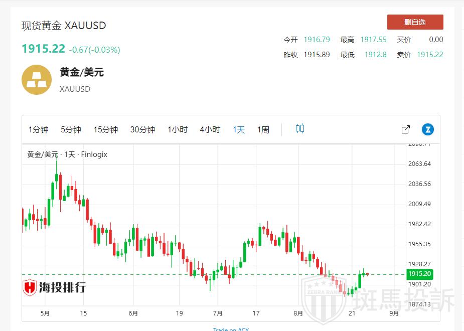 EC Markets提醒:周五(8月25日),国际金价小幅走低,因美元指数(104.1621,0.2083,0.20%)升至6月7日以来新高104.276,但金价几乎铁定时隔四周后重新收涨。投资者等待美联储主席鲍威尔即将发表的讲话,这可能为利率前景提供线索。北京时间15:24,现货黄金下跌0.15%至1913.61美元/盎司;COMEX期金主力合约下跌0.29%至1941.4美元/盎司;美元指数上浮0.20%至104.189。