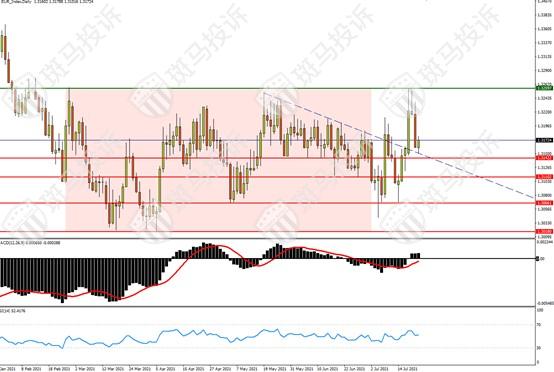 实际上,从6月美联储的利率决议突然放鹰,提早加息预期至2023年前,美元便明显走强,在美元指数占比高达56%的欧元也就持续向下。总计7月至今,欧元/美元已从1.1850上方一度跌至1.1750水平,目前虽然回到1.18水平附近,但跌势正在延续。