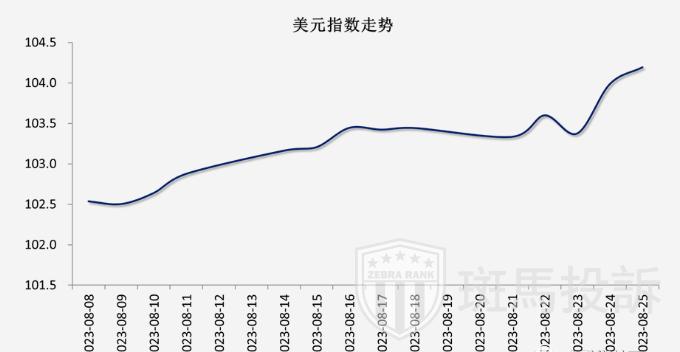 外汇市场:上周,美元指数延续强势,主要原因一是欧美主要国家8月PMI数据出炉,相比欧元区和英国,美国的基本面依旧显示出明显的比较优势;二是上周五鲍威尔在2023年杰克逊霍尔全球央行年会上发表演讲,再次重申将维持2%的通胀目标不动摇,偏鹰的表态支撑美元指数再创两个多月来的新高。截至上周五,美元指数较前一周上涨0.68%,收于104.077,连续第六周收涨,刷新15个月以来最长周连涨记录。国内方面,上周人民币跌势暂缓,基本呈现平稳震荡的走势。周一早盘前,LPR非对称降息落地,CNY开盘较中间价偏弱超900点,并快速突破7.30关口,一度走弱至7.31上方,接近8月17日创的去年11月3日以来最弱水平,在这一点位附近大量结汇盘涌现,带动人民币回升。此后几天,CNY稳定在7.30下方震荡,加之上周离岸央票发行前后,离岸人民币流动性收紧,CNH带动CNY进一步回升,离岸在岸价差有所收敛。截至上周五,人民币对美元收于7.2884,累计升值0.02%,终止三连跌。