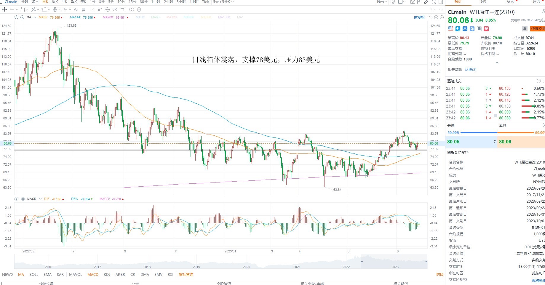 美原油短期维持箱体震荡,目前并未突破箱体压力,而均线拐头向上,大概率维持震荡上行,不过需要基本面进一步的确认,若库存数据进一步下行,同时需求端压力放缓,则有望支撑油价向上突破,日内等待回踩低吸机会,日线级别支撑78美元,上方压力83美元,突破则打开上行空间