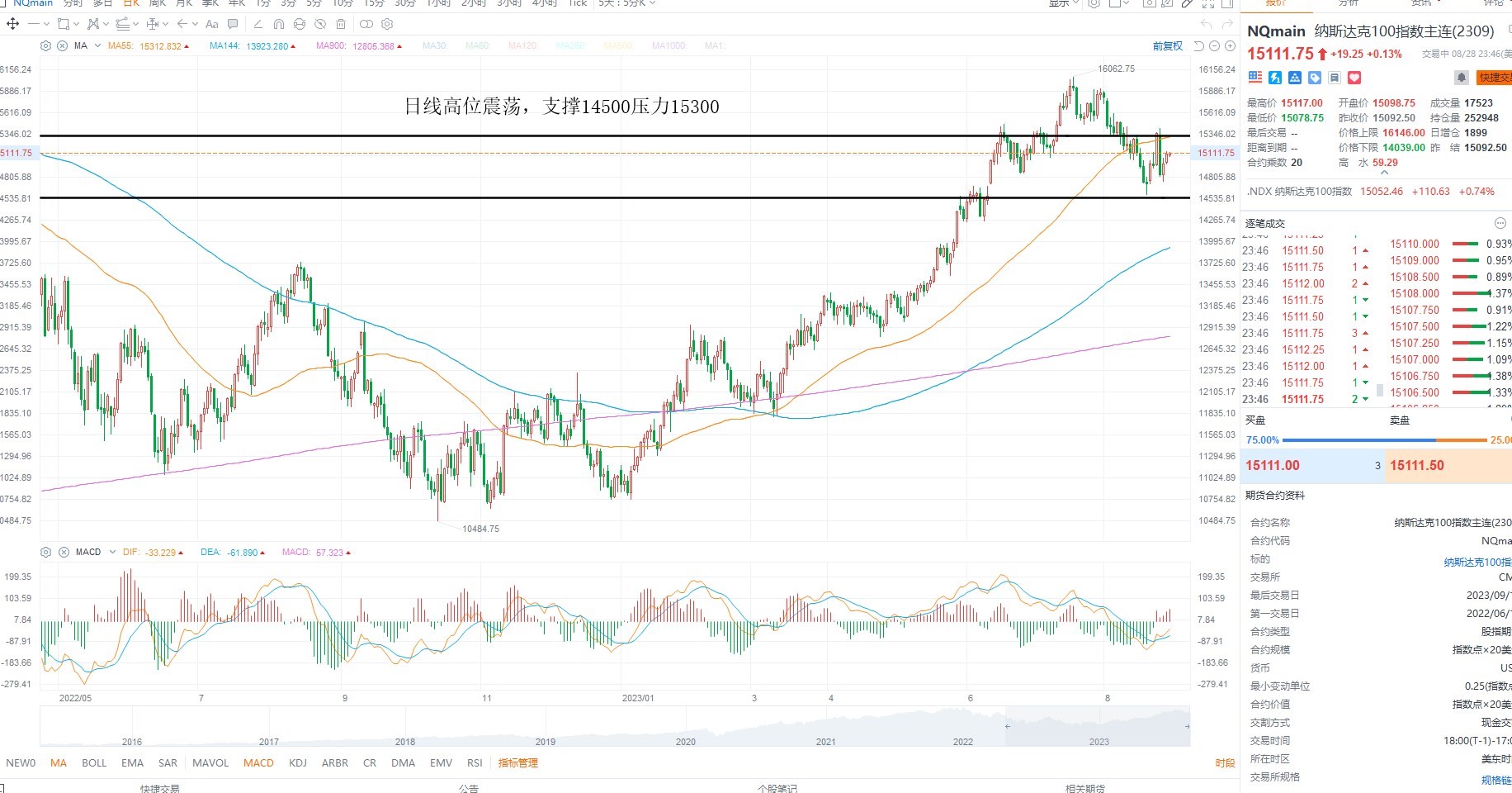 纳斯达克指数维持高位震荡,短期来看,多头走弱,虽然分母端估值上行,美债收益率下行,但并未能支撑权重出现共振走强,日内维持箱体对待,等待指标修正为主,日线级别箱体压力15300突破则有望重返多头区间,下方支撑14500附近,高抛低吸为主