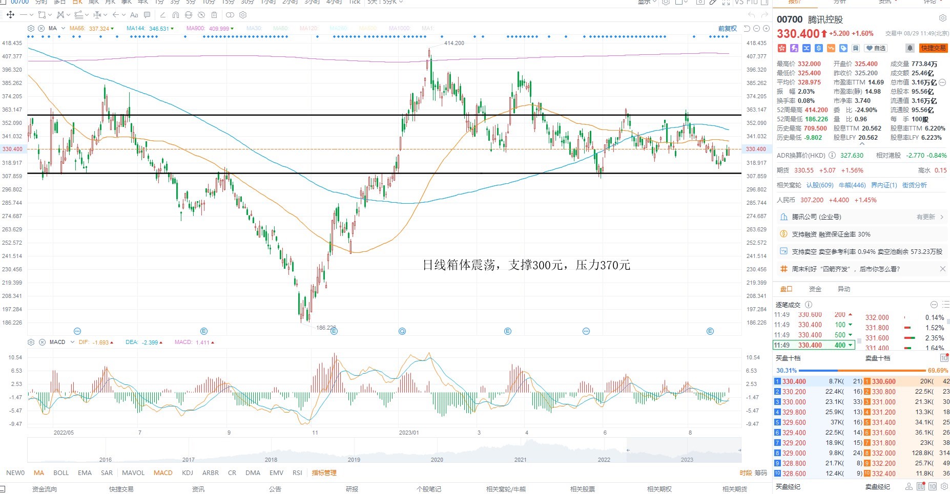 腾讯控股短期维持箱体震荡,市场风偏有所回暖,但是并未能使得流动性进一步走强,结构上需要等待指数级别的共振才有可能进入多头正循环,继续观察流动性是否进一步释放,日内支撑300元上方反复低吸,等待箱体压力370元附近测试为主