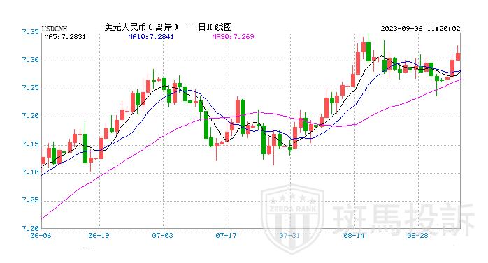 2023年9月6日,离岸人民币(7.3089,0.0054,0.07%)兑美元短线走低约百点,日内跌近200点,目前报7.3211。