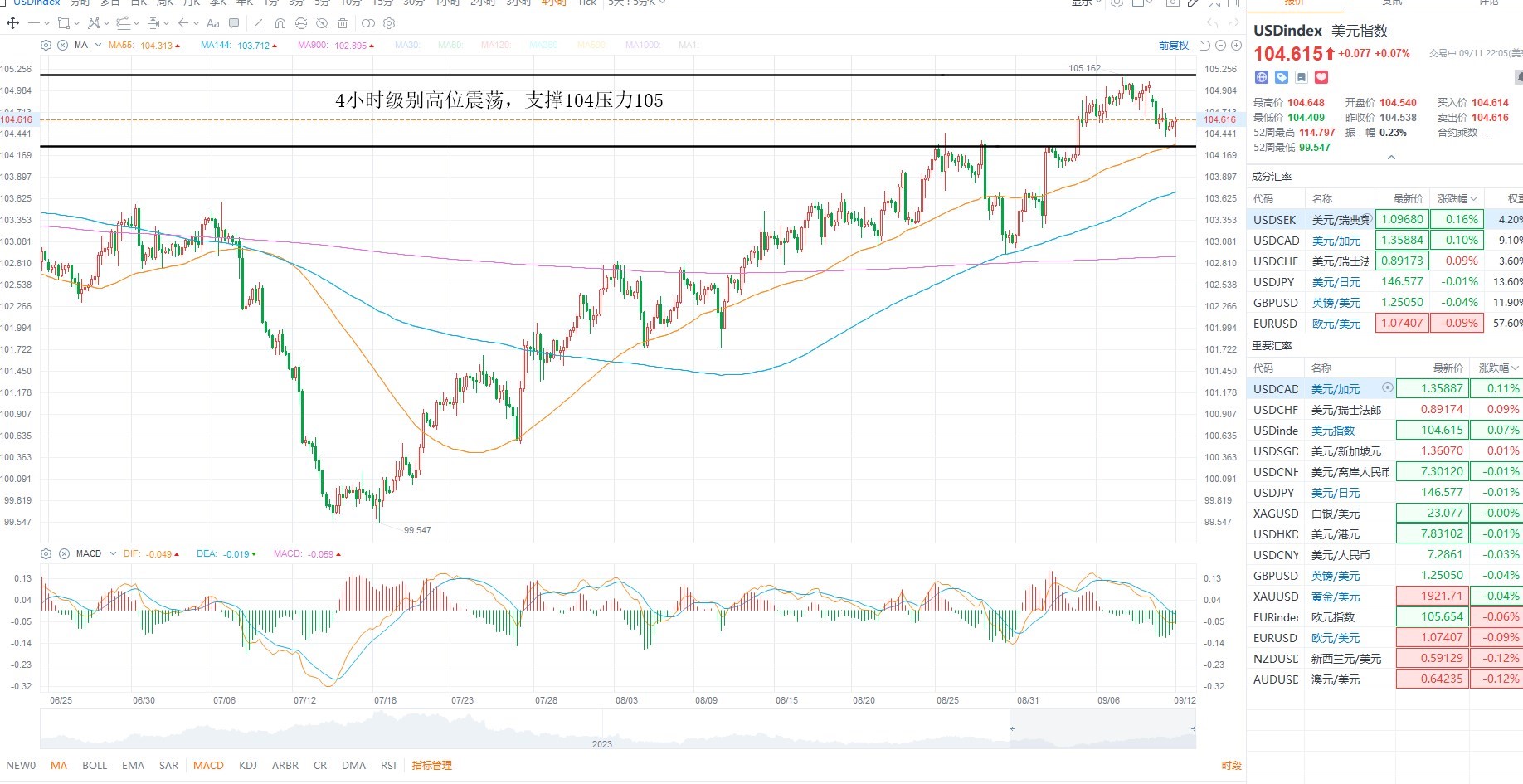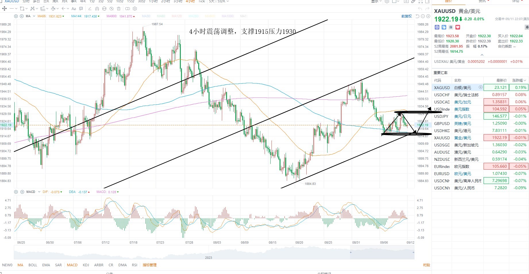 美元指数高位震荡,短期并未出现明确的方向选择,基本面上市场在等待美联储本月的议息会议,是否维持加息,或者是年内最后一次加息,对美元指数的方向指引意义相对较大,等待方向选择为主,金价方面短期维持超跌反弹,目前属于二次回踩之后等待企稳机会,结构上存在继续向上的可能性,等待下降趋势线突破为主,美原油方面震荡上行,等待EIA月报之后的加速机会为主,日内维持多头结构不变