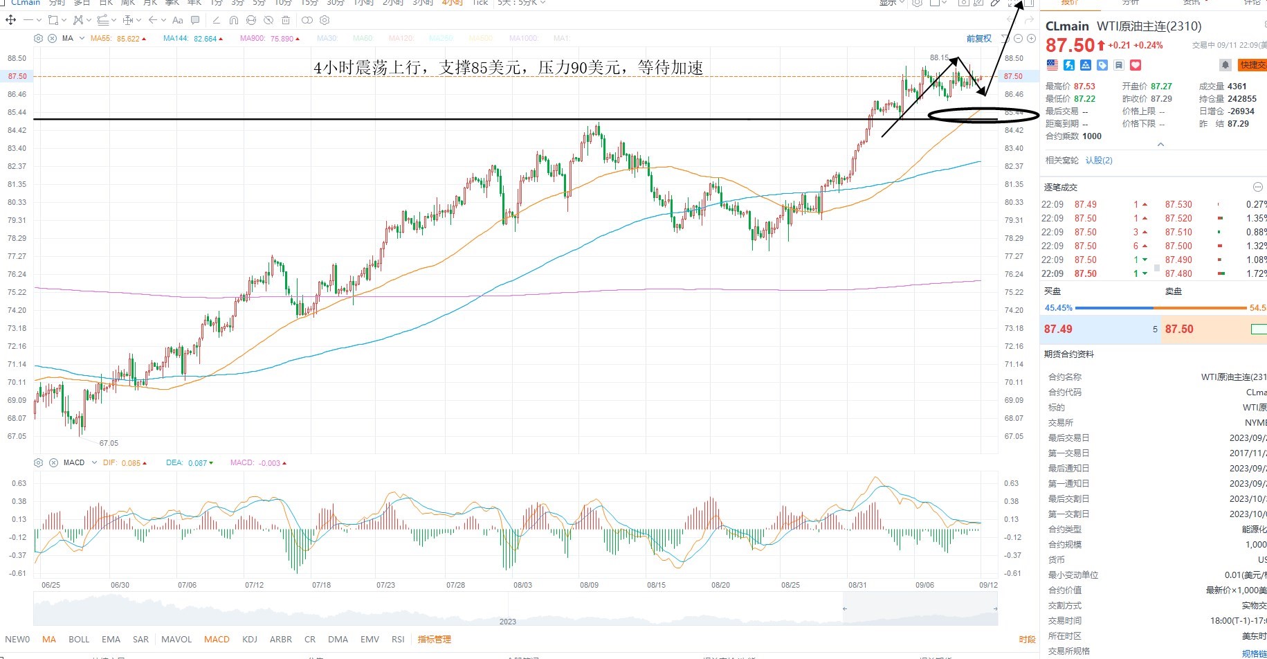 美原油短期维持高位运行,但并未突破前期高点,且并未出现加速迹象,基本面上供给端压力依然很大,支撑油价走强,而需求端则需要等待本月利率决议之后的方向选择,若通胀拐头,加息结束,则需求端有望回暖,从而支撑油价向上突破,日内支撑85美元附近反复低吸,上方压力90美元附近
