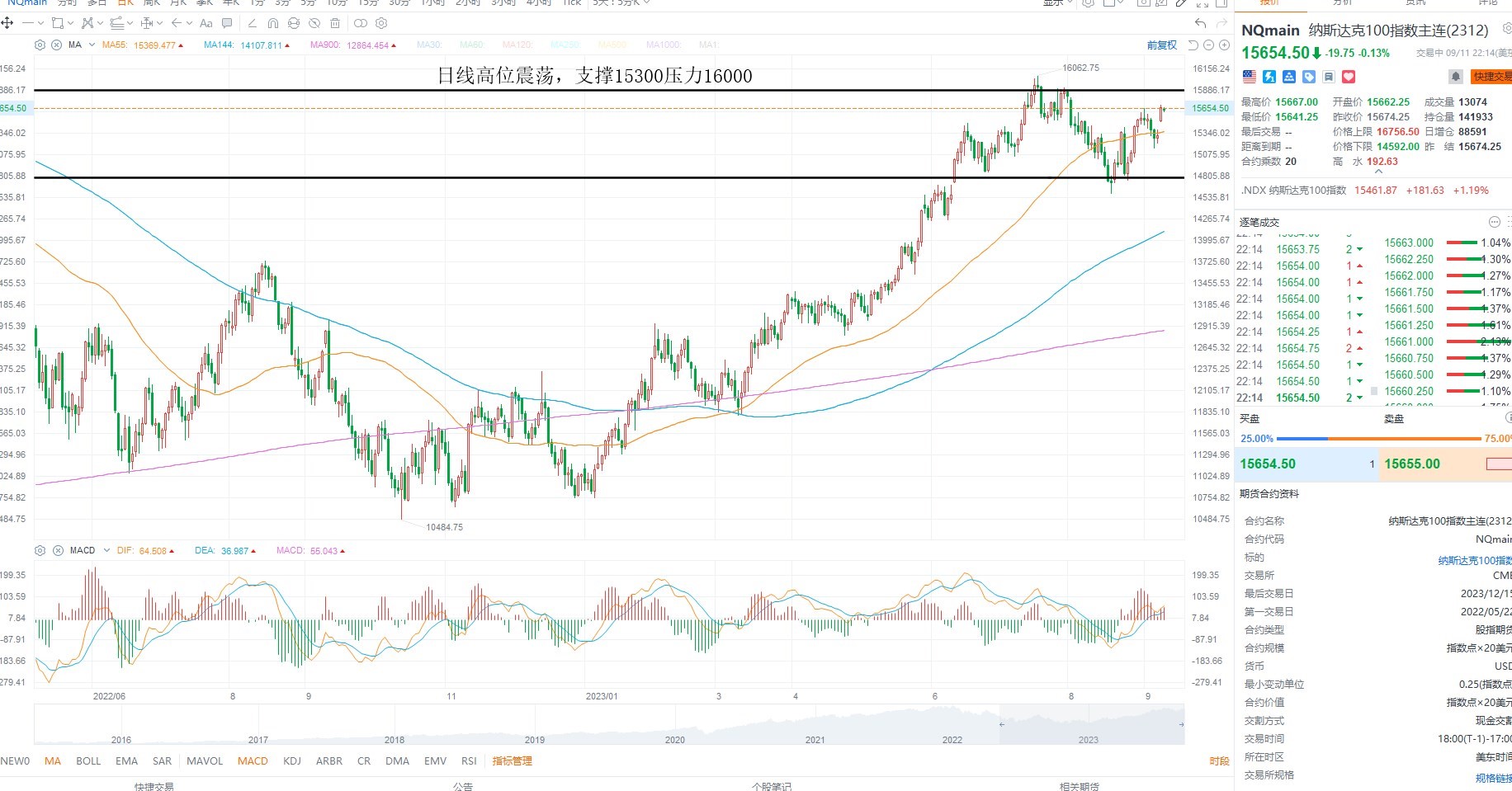 纳斯达克指数维持高位震荡,短期并未突破前期高点,而基本面上风偏尚未进一步回暖,同时美债收益率维持高位震荡,短期指数突破的概率不大,维持箱体对待,高抛低吸为主,日线级别压力16000附近等待沽空,下方支撑15300附近