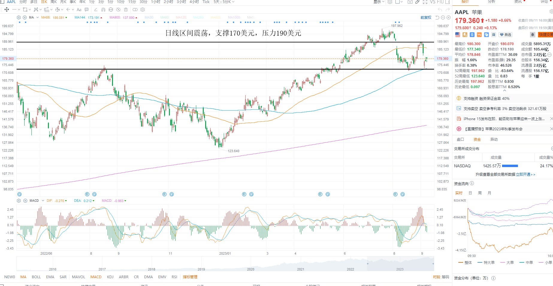 AAPL短期高位震荡,新品发布会在即,结构上并未破位箱体支撑,而指数有望继续走强,但是新高的概率不大,因此AAPL维持区间对待,切勿追涨,谨防新品销售不及预期,进入中期调整,日线级别多空分水岭170美元附近,上方压力190美元附近