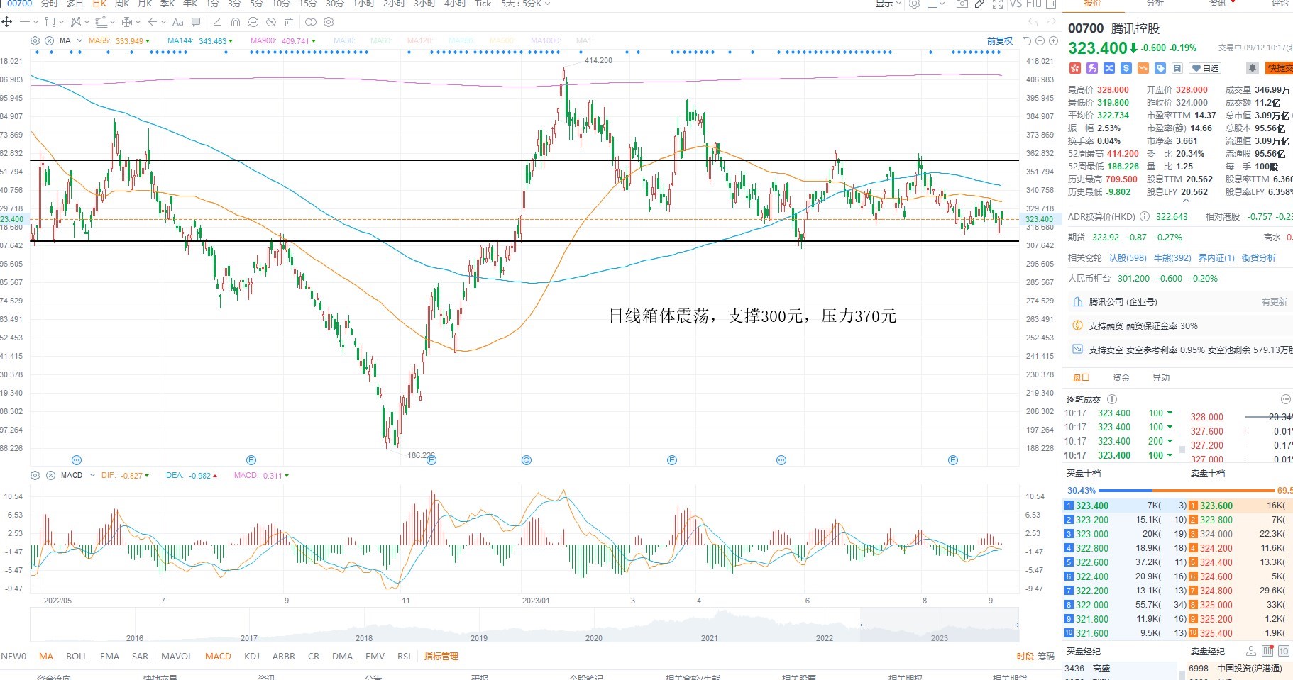 腾讯控股短期依然在箱体下沿震荡,但恒生科技估值已经很低,所以这里需要等待情绪的共振,一方面是成交放大,一方面是权重带动指数点燃做多情绪,日内支撑300元不破的前提下反复低吸,上方压力370元附近