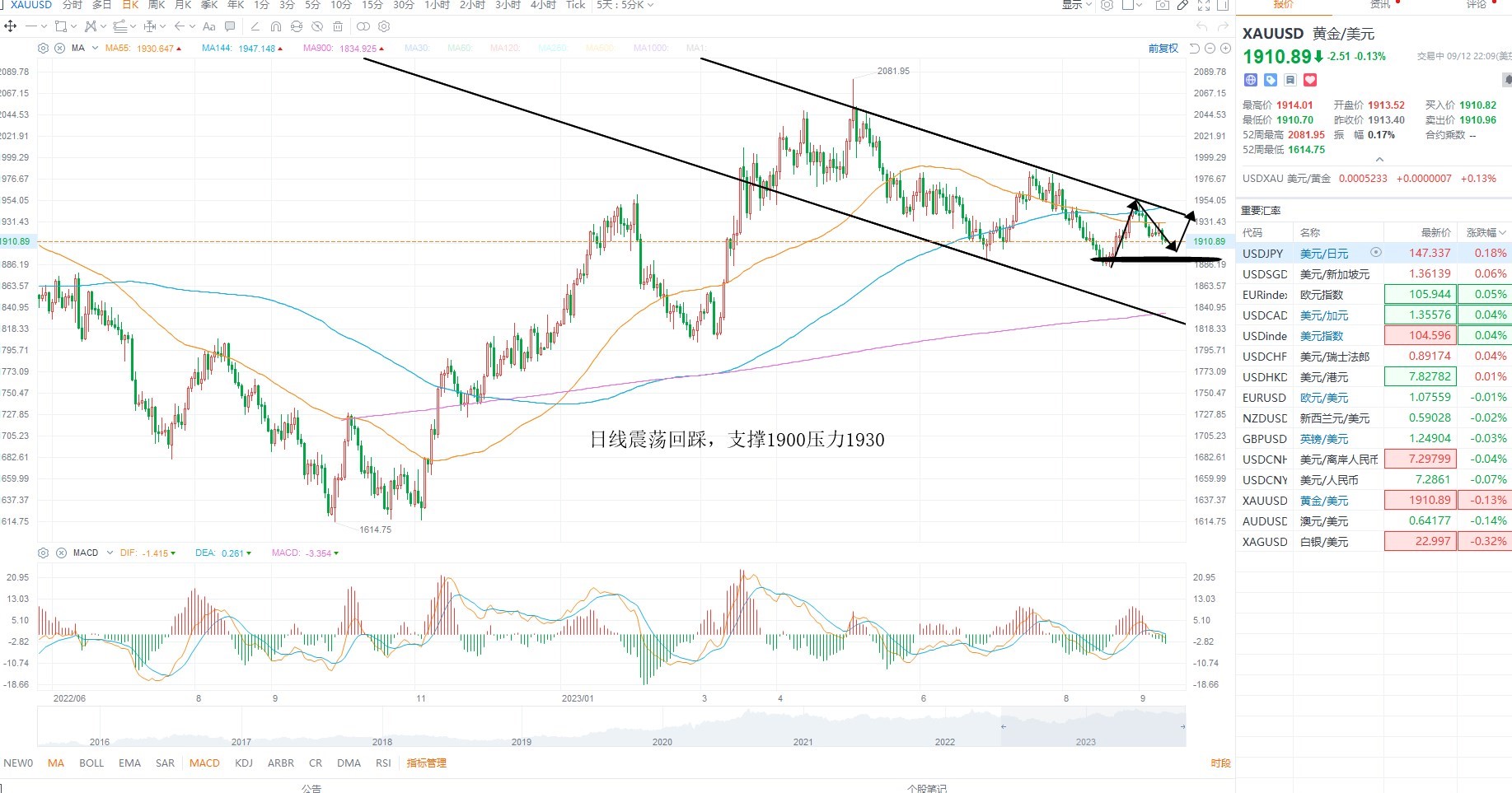 黄金短期继续走弱,超跌反弹并未突破下降趋势线,且结构上依然是下降趋势之内,基本面上加息预期升温,叠加美债收益率高位运行,不利金价走强,短期等待1900整数关支撑确认为主,若盘整于1900上方不破,则有望继续反弹,上方压力1930附近,下方跌破1900则不排除新低的可能性