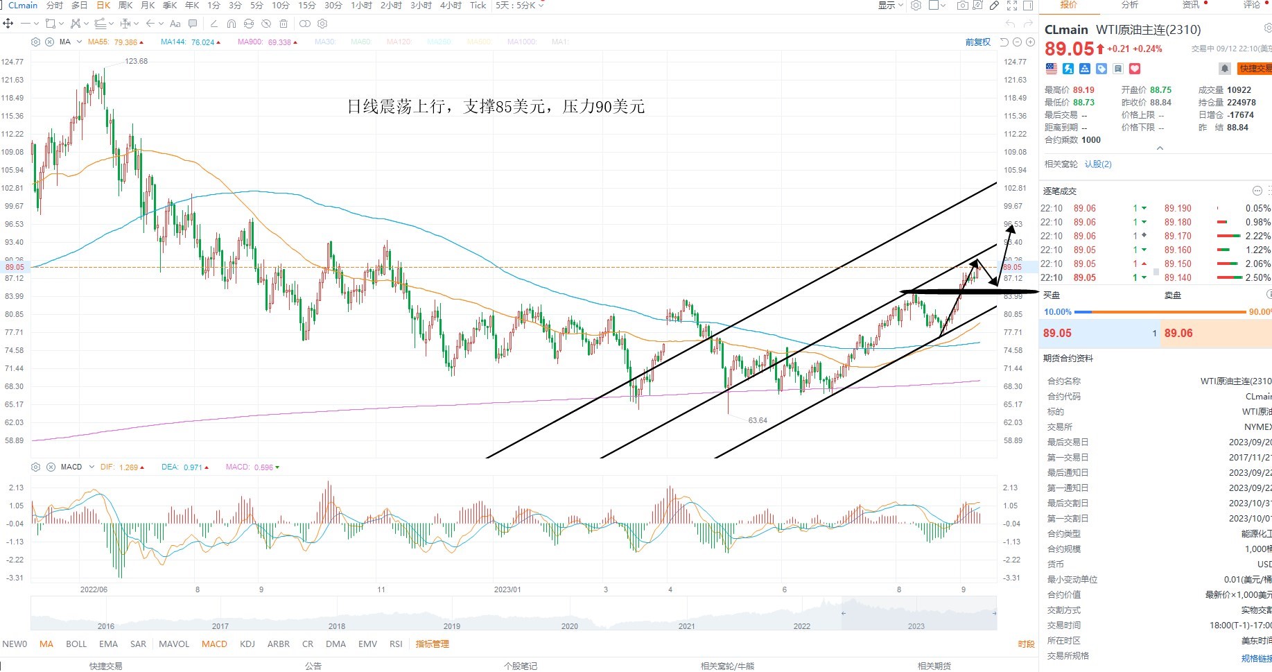 美原油短期继续走高,基本面上商品共振走强,叠加供给端压力进一步升温,继续关注库存数据的变化,短期油价等待突破中轴线之后的加速机会为主,日线级别支撑85美元不破,多头结构不变,上方突破90美元整数关,则有望测试93美元附近压力