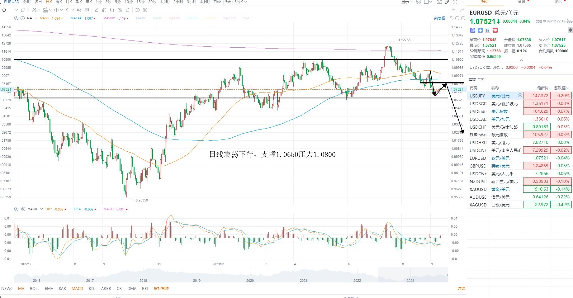 欧美短期维持在低位运行,整体结构上处于下行趋势,虽然美元指数并未突破箱体压力,但是加息预期进一步升温,需要等待本月利率决议之后的方向选择,在此之前,非美偏空为主,日内等待反抽沽空给机会,欧美日线级别多空分水岭1.0650附近,上方反抽压力1.080