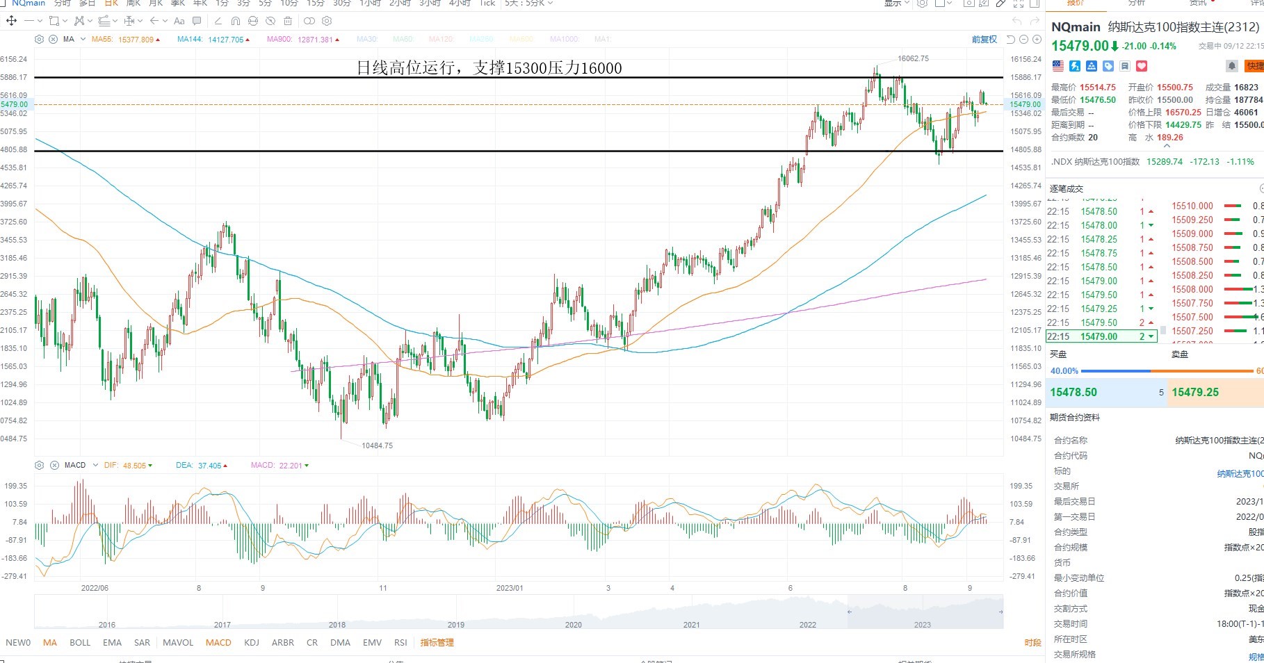 纳斯达克指数冲高回落,短期符合箱体运行结构,因市场风偏并未进一步回暖,所以整体结构不支持指数向上突破,等待箱体下沿低吸机会为主,日线级别上来看,若回踩15300破位,则在此测试前期低点14800附近,上方压力16000附近