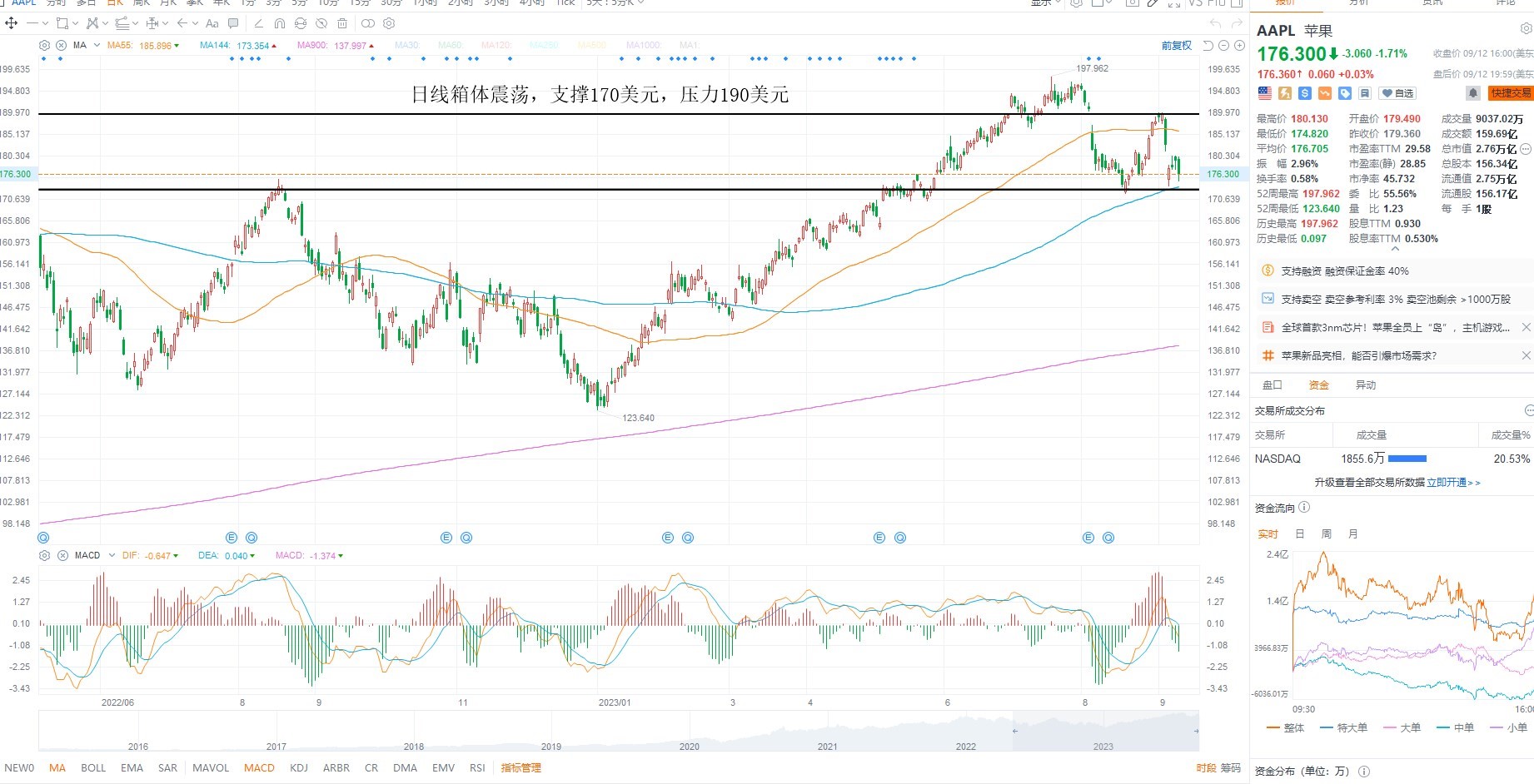 AAPL新品发布之后快速回落,短期来看,这里并未走出多头震荡,依然是箱体运行,且指数风偏进一步下行,不利价格向上突破,继续关注销售预期的变化,日线级别上来看,短期跌破170美元则存在见顶的可能性,上方箱体压力190美元附近,等待方向选择