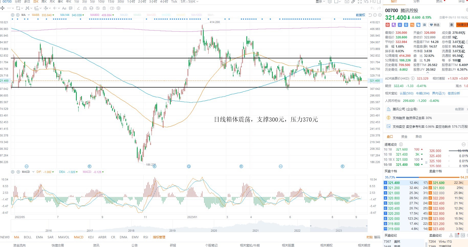 腾讯控股短期维持箱体震荡,市场没有企稳之前,整体结构依然需要等待流动性回暖之后的加速机会,基本面上权重分化,指数低位运行,多头情绪不足,日线级别箱体支撑300元没有破位之前,等待企稳低吸机会,上方压力370元