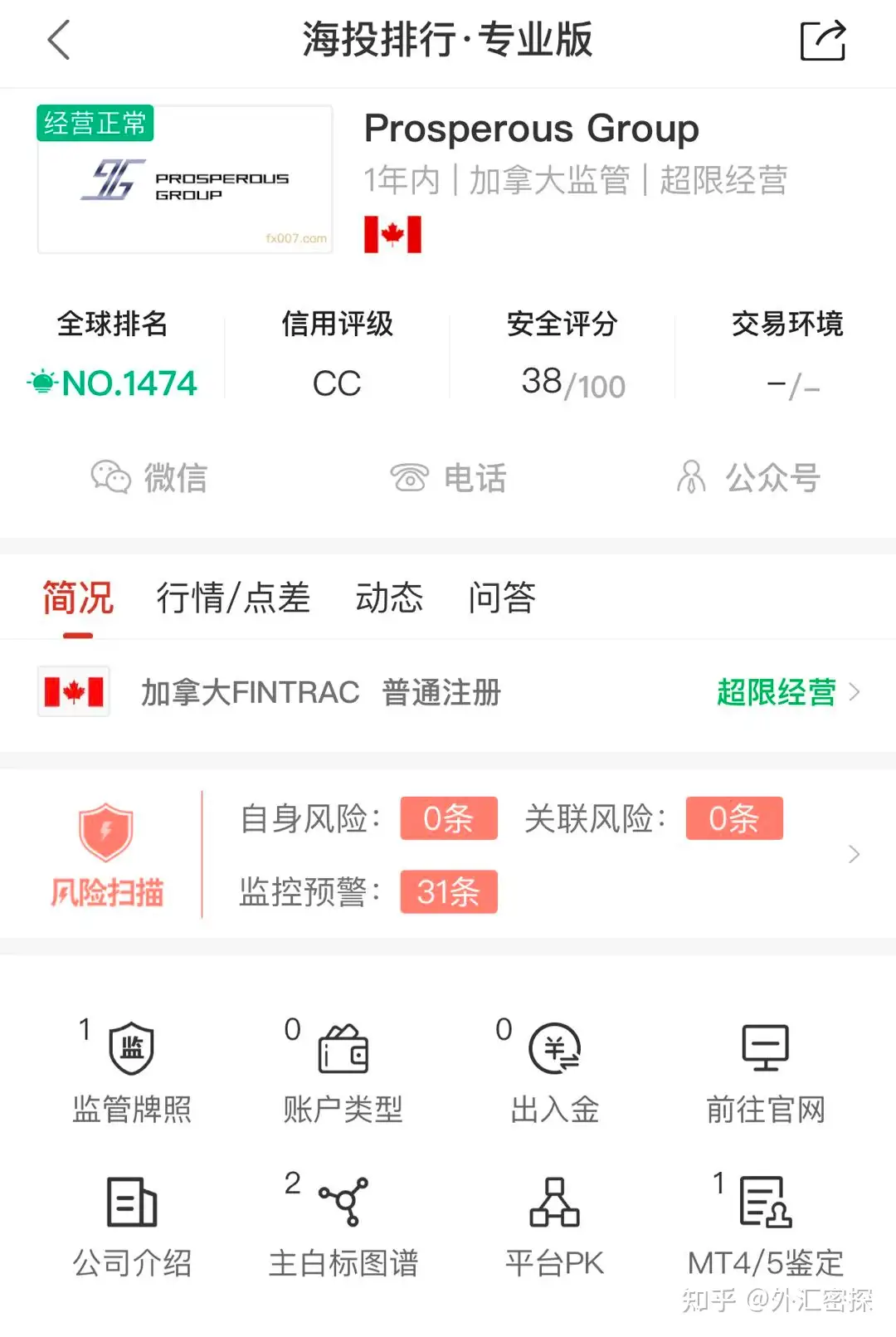 据海投排行资料显示,成立不到1年时间,全球排名1474位,目前持有加拿大FINTRAC普通金融牌照,可以进行货币兑换,但是不能从事外汇保证金业务,也没有隔离银行存管服务,客户资金全部都在Prosperous Group平台内。