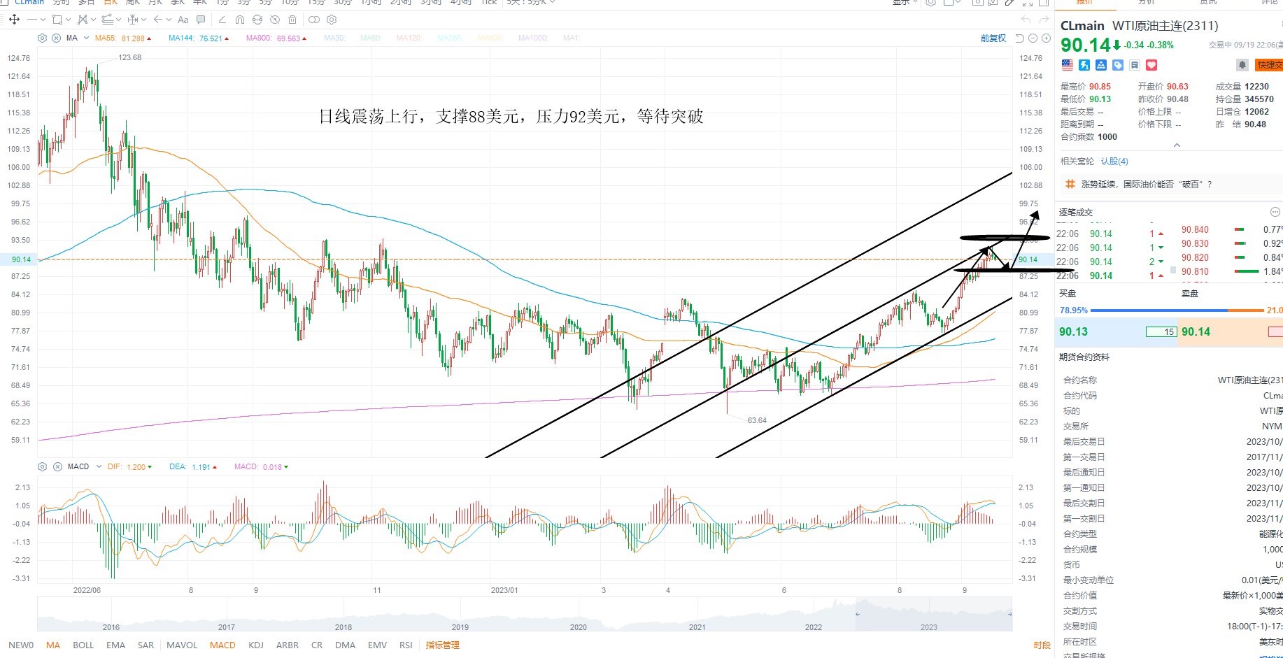 美原油冲高回落,但是依然在多头结构之中,基本面上供给端施压,继续支撑油价,等待美联储加息落地之后观察需求预期是否进一步回暖,从而形成共振走强,日内关注库存数据的变化,日线级别压力92美元突破,则有望打开上行空间,下方支撑88美元附近