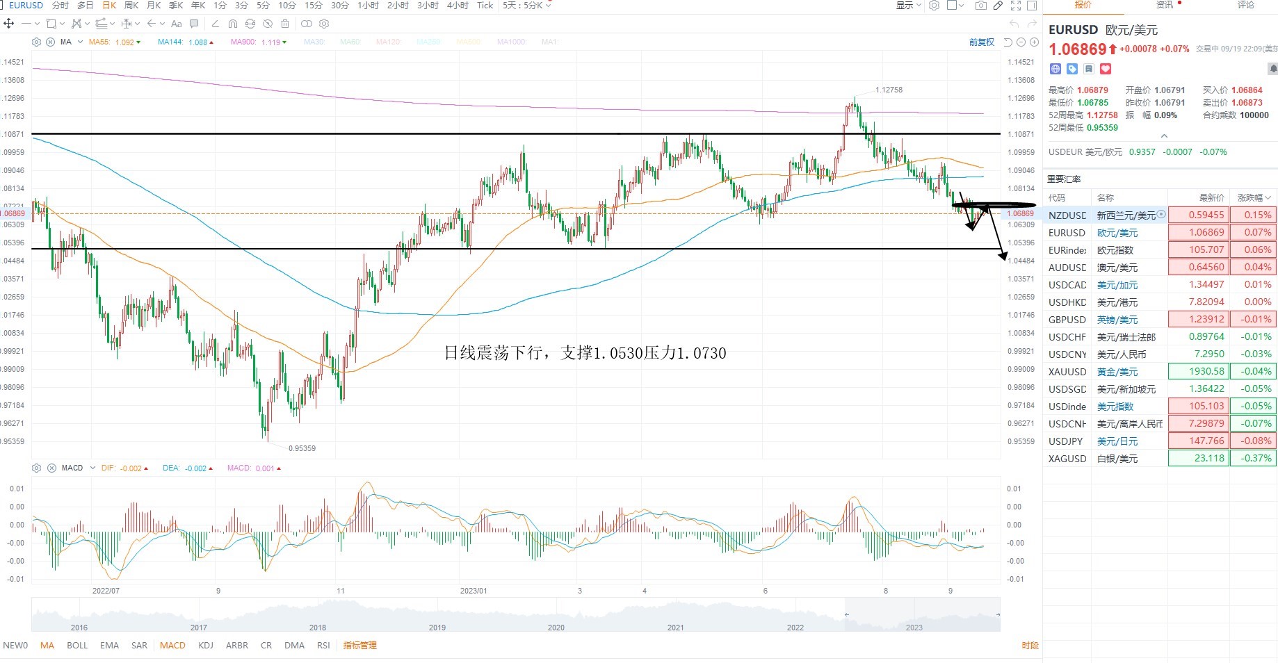 欧美维持震荡下行,虽然低位有所反弹,但是受美元指数的限制,非美短期偏空,且美联储利率决议尚未落地之前,美元指数大幅调整的概率不大,日内非美等待反弹之后的沽空机会为主,欧美日线级别压力1.0730附近等待沽空,下方支撑1.0530