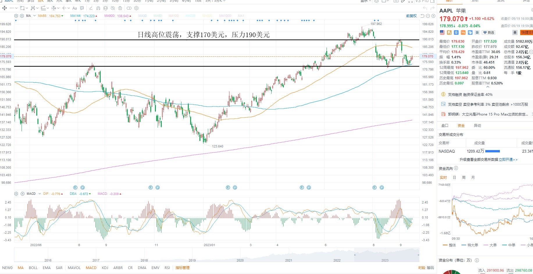 AAPL震荡反弹,短期来看,这里属于高位震荡,但并未破位箱体支撑,主要是美债收益率走强,不利风险资产走高,且纳斯达克指数日内调整,不排除权重共振走低的可能性,短期偏区间对待,日线级别支撑170美元附近低吸,上方压力190美元附近高抛