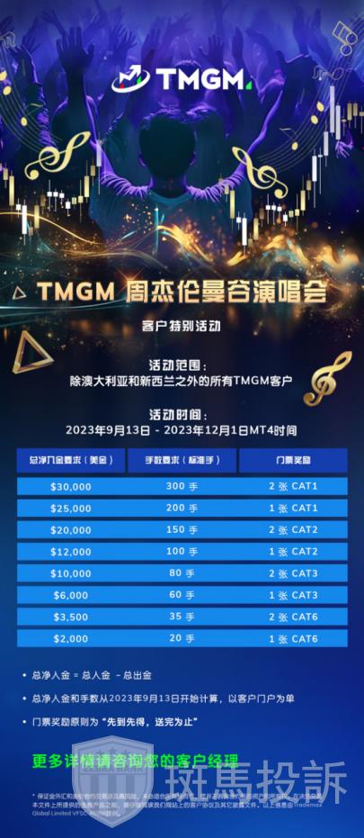 只要满足相应等级的入金数额,就将获得对应等级的演唱会门票!最低入金600美金,超低门槛,人人都可参与!一票难求, TMGM帮您搞定!