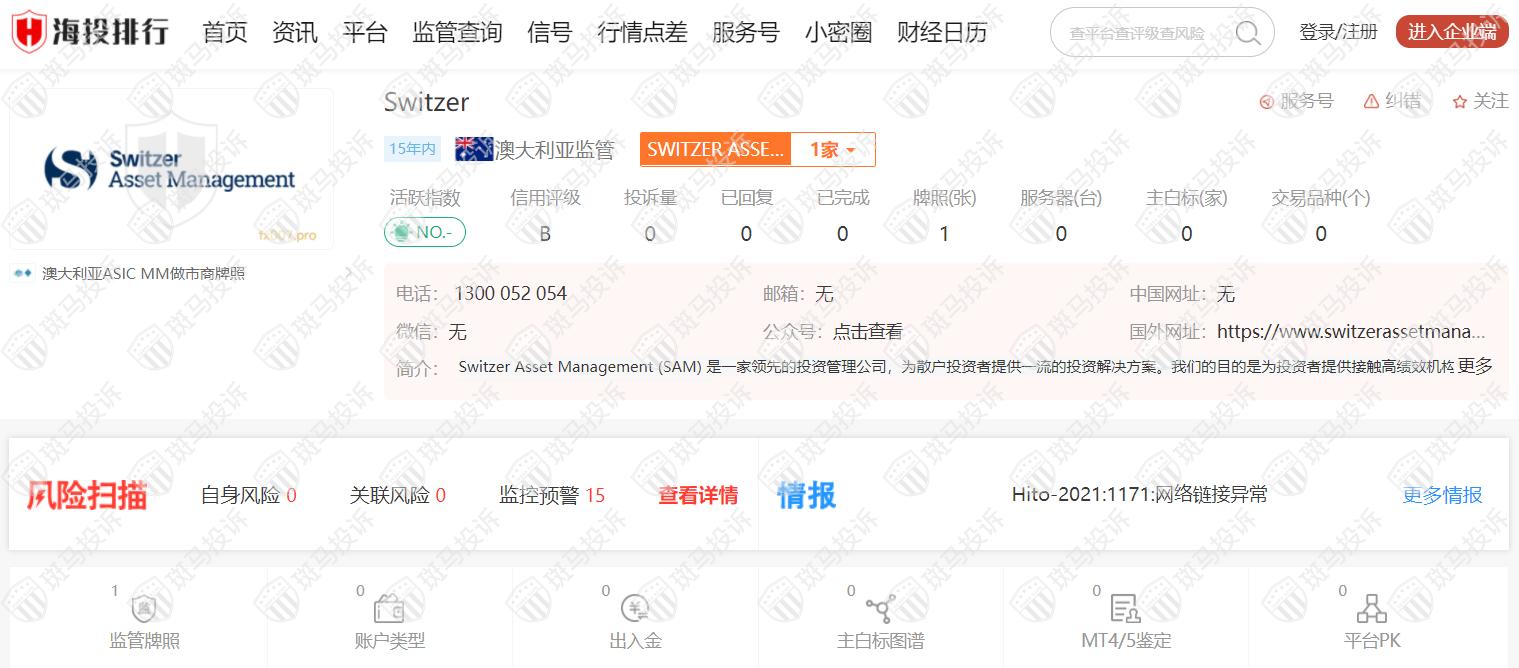 Switzer从2007年开始受澳大利亚ASIC监管,监管号码312247,风险扫描显示15条风险,投资者需注意其风险提示信息。