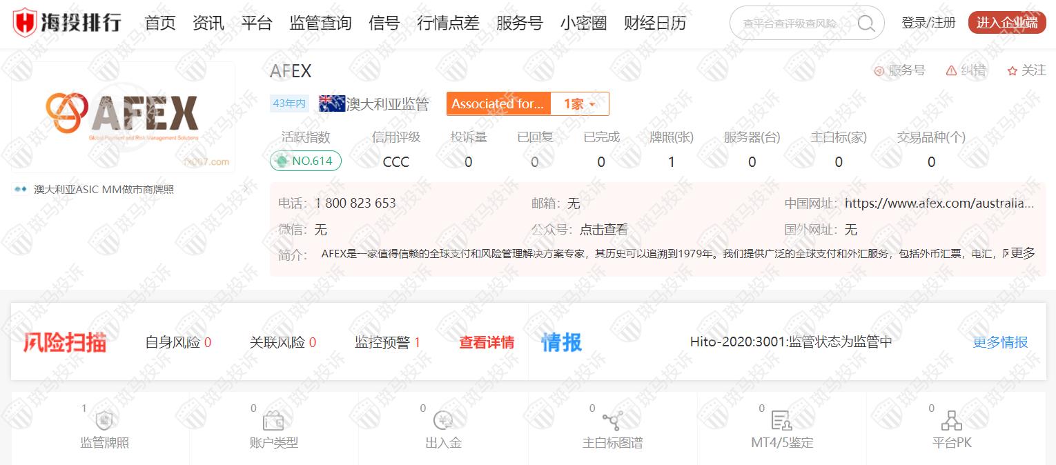 AFEX从2006年开始受澳大利亚ASIC监管,监管号码305246,风险扫描显示1条风险,投资者需注意其风险提示信息。