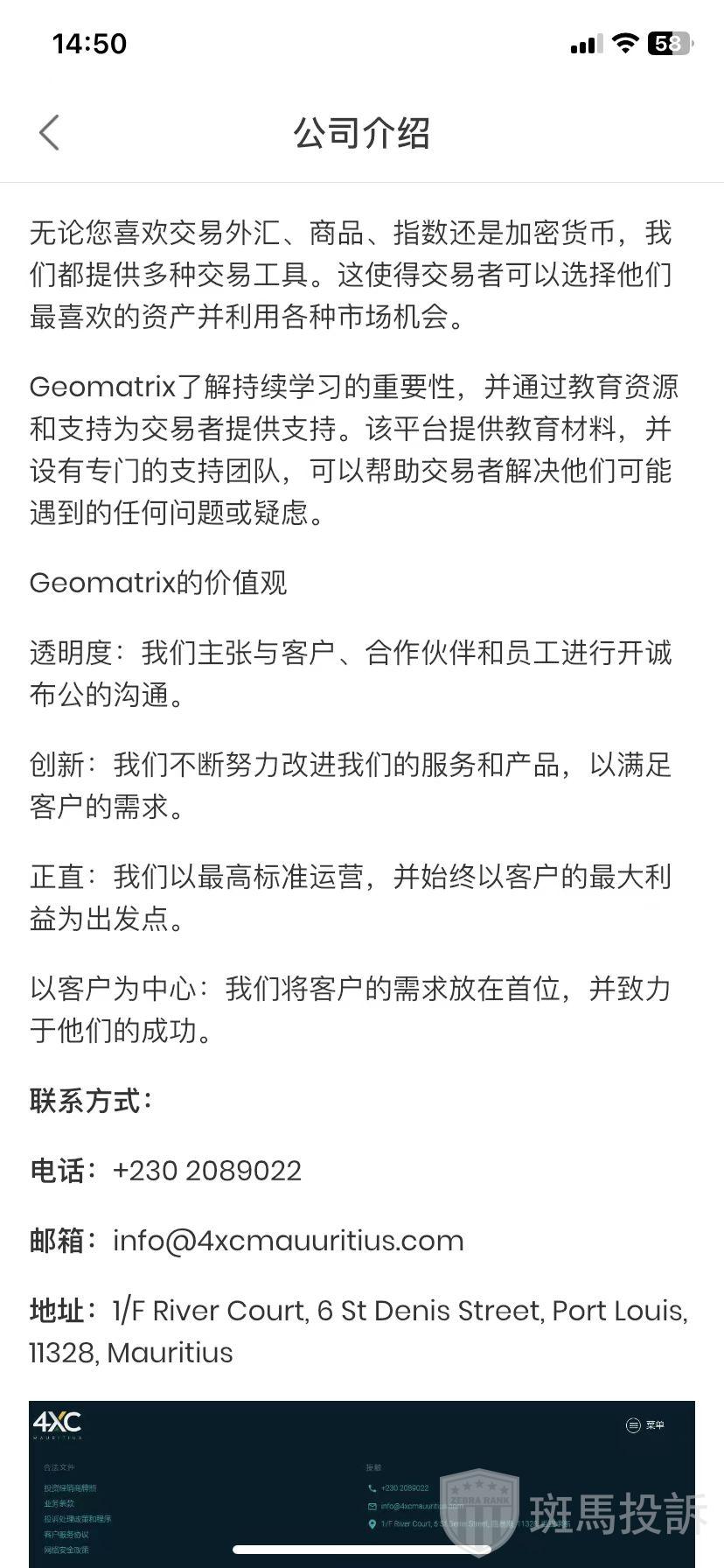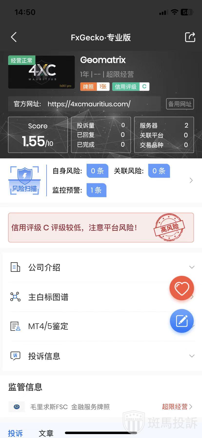 Geomatrix,在FxGecko显示超限经营。对外宣称持有的毛里求斯FSC牌照提示超限经营,暂时未查证到其他有效监管牌照,存在巨大风险!