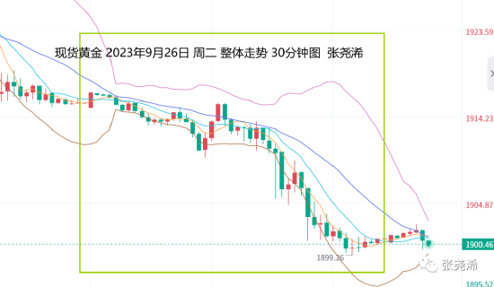 63美元后,则遇阻承压回落运行,且延续到美盘时段,回落力度加大,在跌破1910美元的同时,仍持续下行,至盘尾触及日内低点1899.00美元后,有所止跌窄幅盘整,最终收于1900.55美元,日振幅17.63美元,收跌15.33美元,跌幅0.8%。