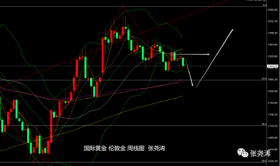 技术上:月图级别,金价近几月走势继续维持在1990-1890美元的区间之内未破,目前走势偏弱震荡,承压于5月均线下方,附图指标信号有转空看跌的倾向,暗示后市回落跌破区间支撑,并触及30月均线支撑的概率依然很大。